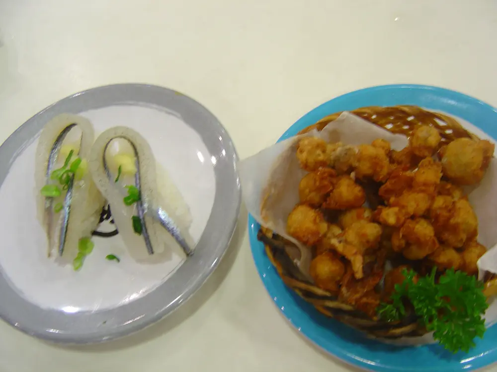 左:針魚壽司,右:炸墨魚咀