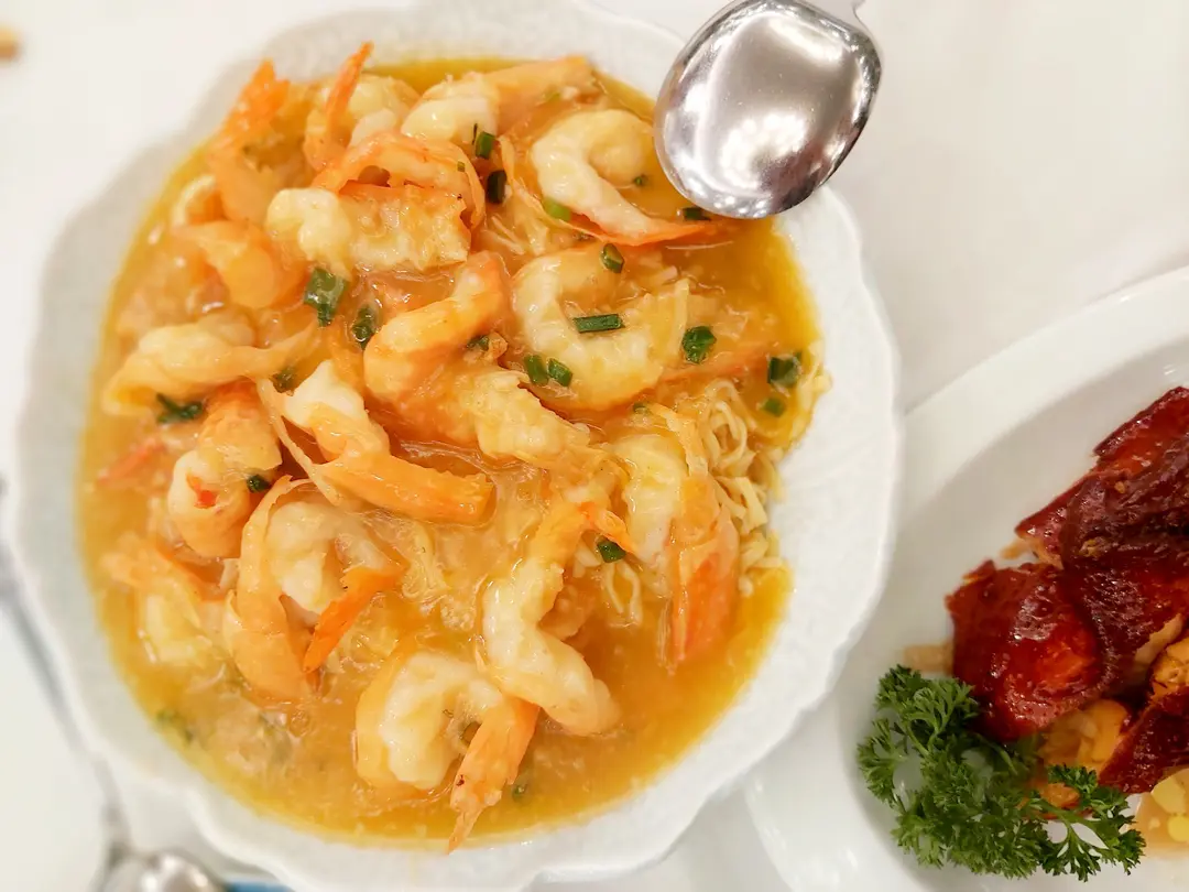 上湯焗開邊海中蝦配伊麵底