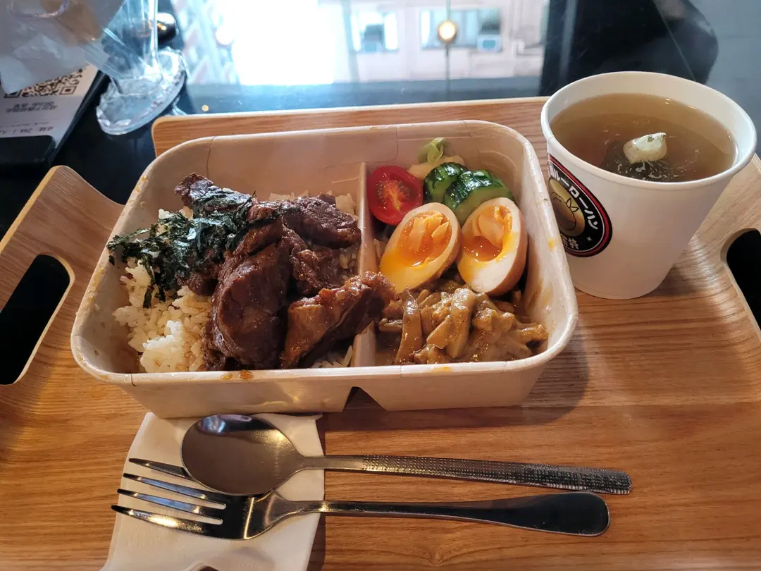 慢煮紅燒牛肋條咖哩素肉絲丼+麥茶