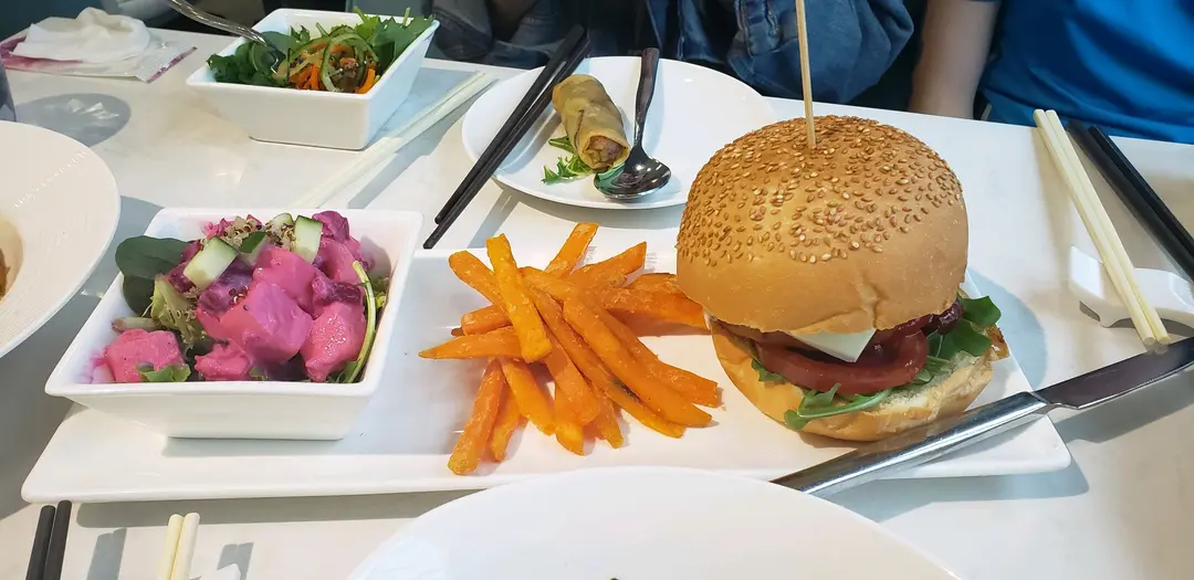 板燒猴菇芝士漢堡 配紅菜頭乳酪沙律及甜薯條