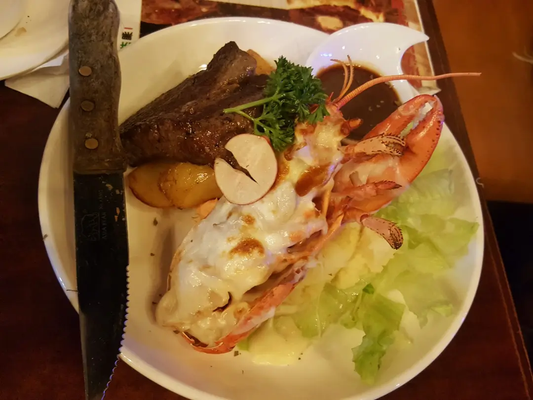 No.303 紐西蘭穀飼牛柳拼芝士白汁焗龍蝦,薯菜