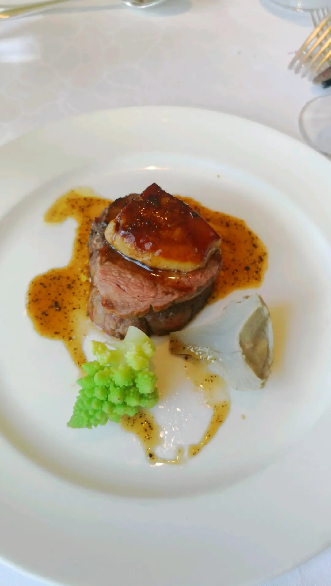 牛柳伴鸭肝、蘑菇汤