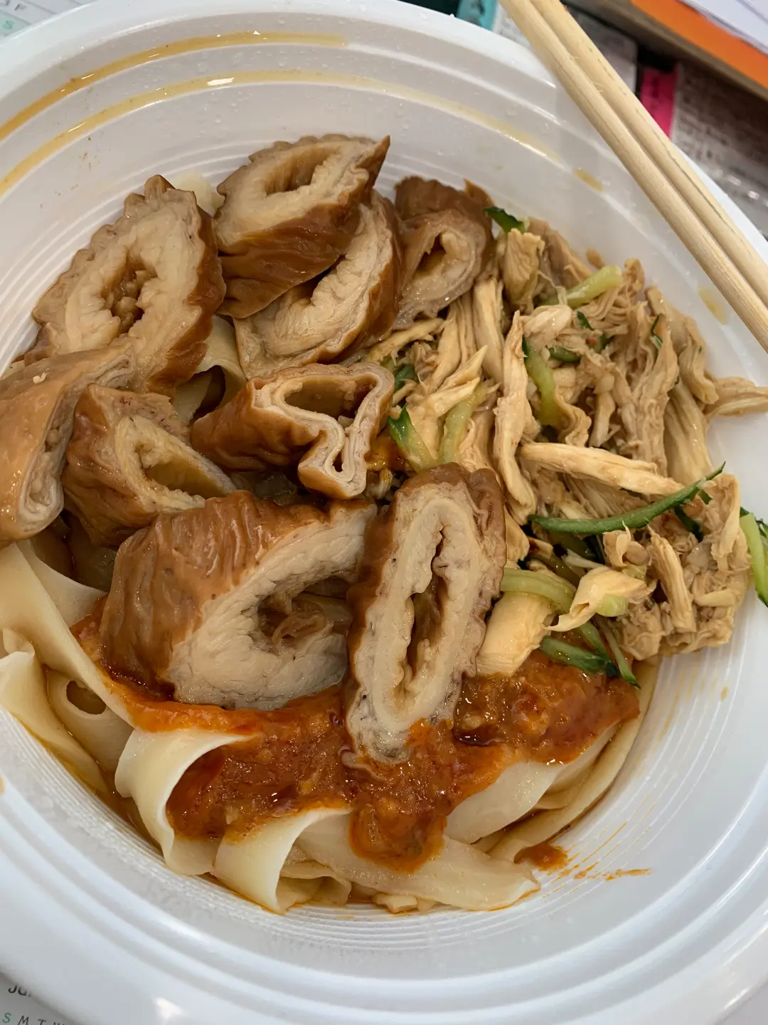 熱拌手撕雞刀削麵另加豬大腸