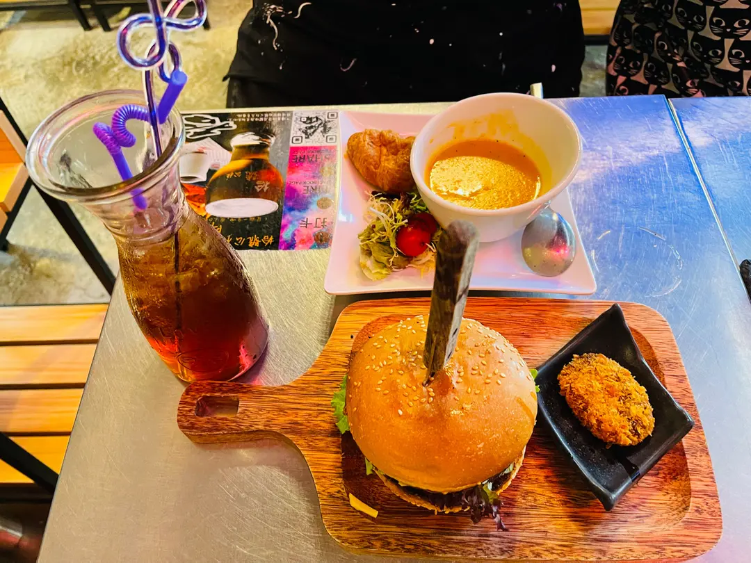 午餐: 和牛漢堡餐配薯波 南瓜湯加沙律 茘枝紅茶