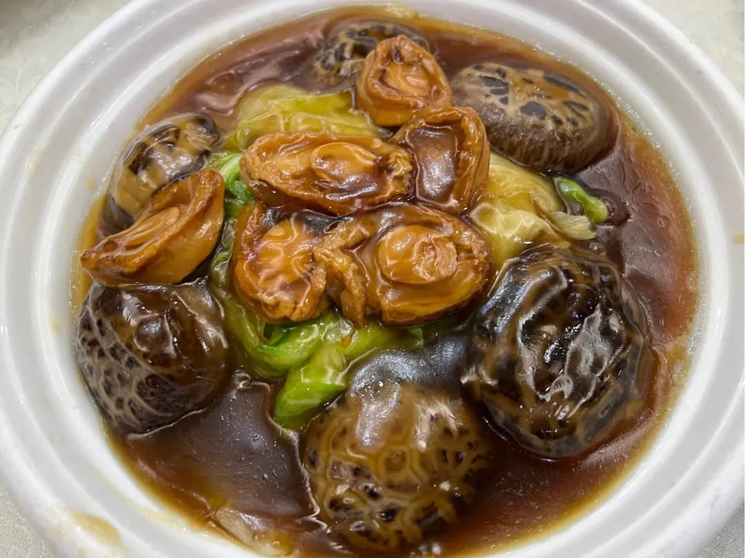 蠔皇金錢八頭鮑魚 stewed abalones with mushrooms, lettuce in oyster sauce
