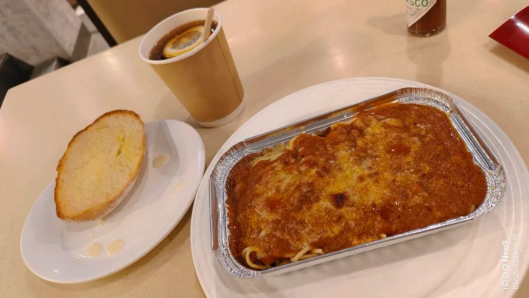 下午茶,餐蕃茄肉醬意粉豬仔包熱檸茶