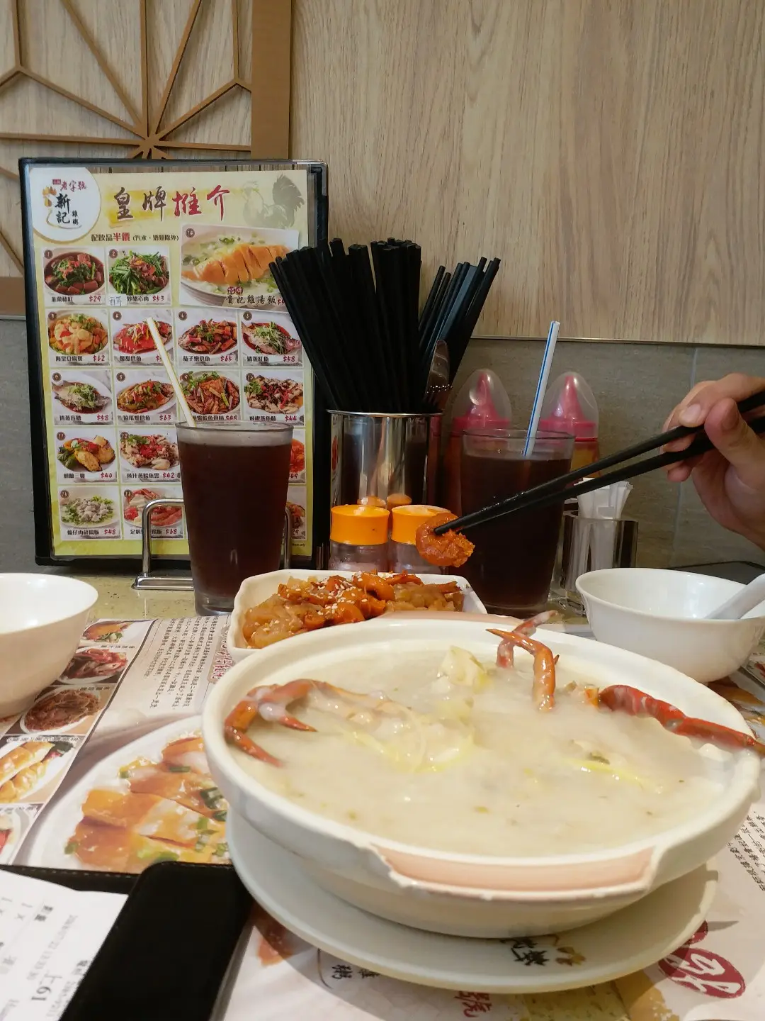 Crab congee (front), jelly fish & intestine (back), 5-flower tea.