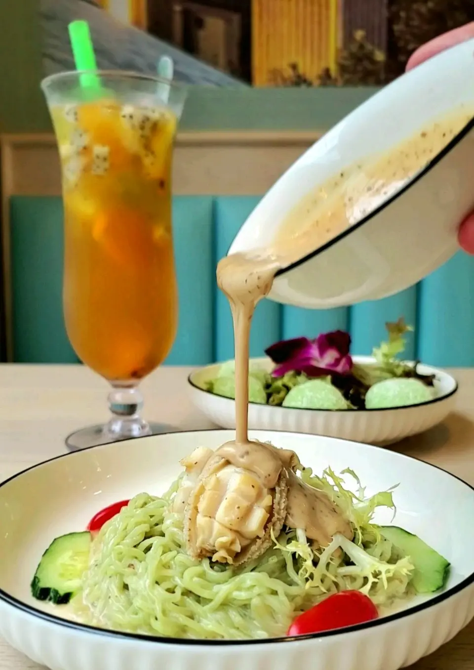 鮑魚菠菜冷麵/百香果水果茶