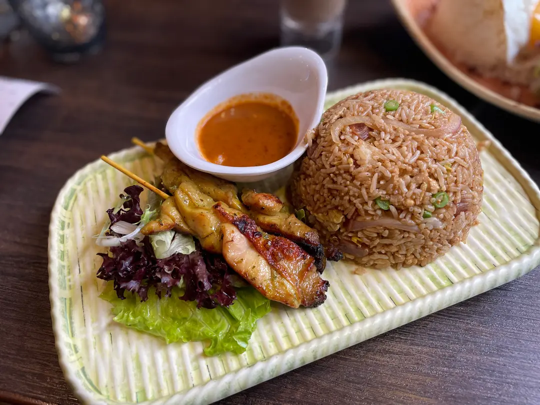 蝦醬炒飯配雞肉串燒