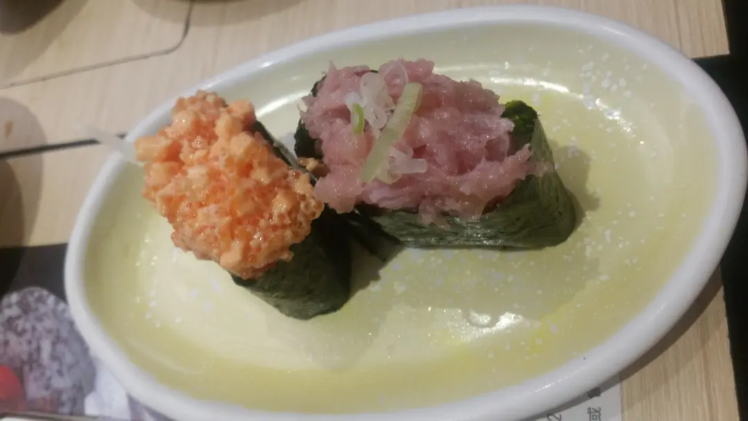 (左)芝士飛魚子軍艦 (右)蔥粒吞拿魚軍艦