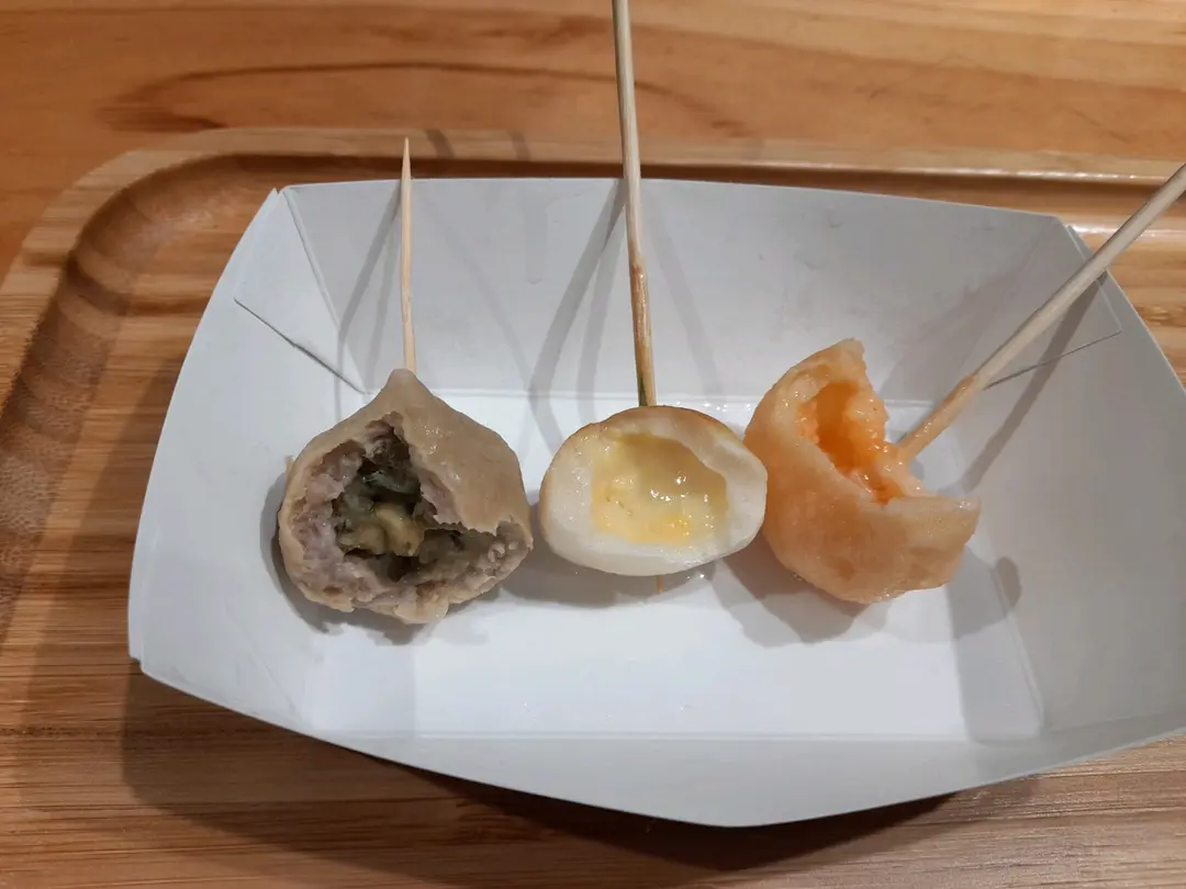 左至右:薑汁皮蛋貢丸,炙燒芝心丸,芥末沙律球
