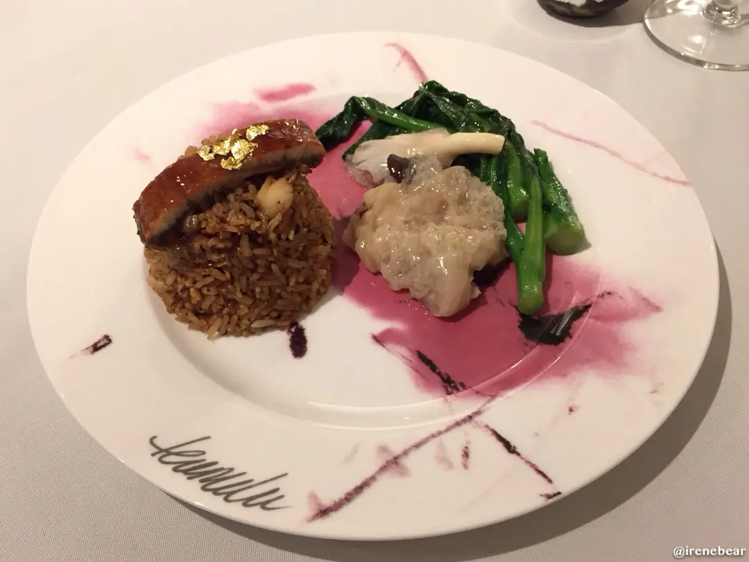 鰻魚海鮮炒飯拼竹笙什菇扒菜苗