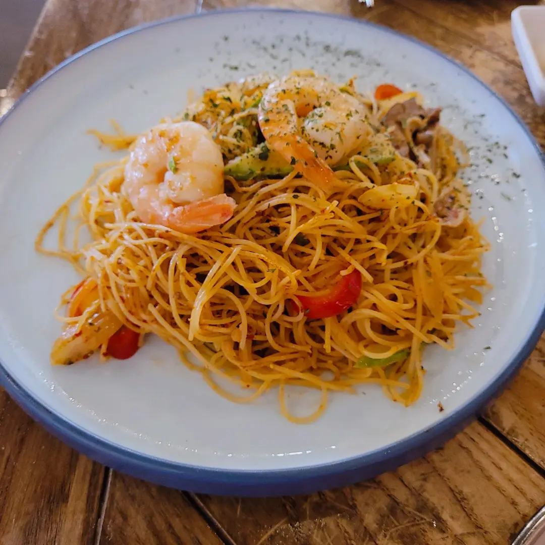 香辣鳳尾蝦野菌炒天使麵