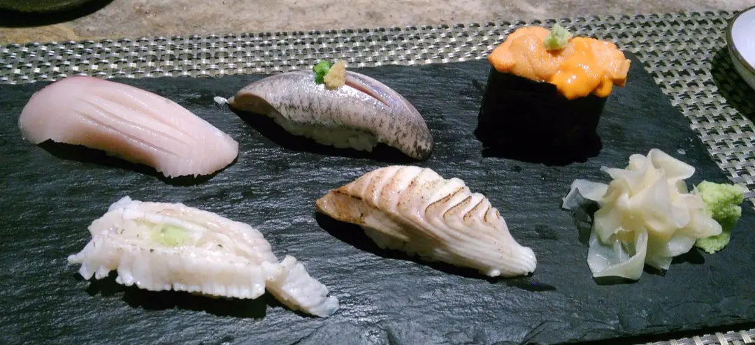 油甘魚腩壽司 / 池魚壽司 / 海膽軍艦壽司 / 左口魚裙邊 / 炙燒銀鱈魚壽司