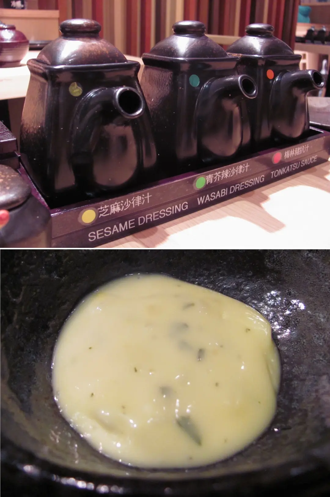 沙律汁及豬扒汁;樓下的是蘸海鮮的如蛋黃醬的東西