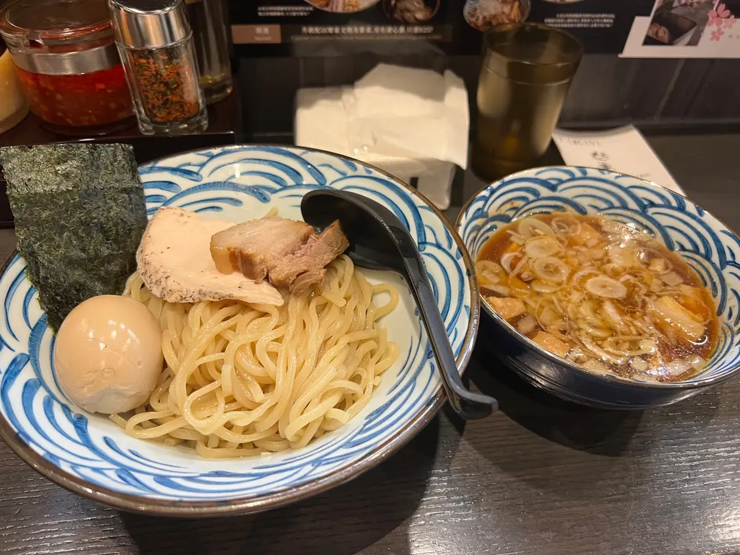 沾麵 Tsukemen (鷄叉燒、豬叉燒、紫菜、竹筍、京蔥、洋蔥 chashu x 2, seaweed, bamboo shoots, scallion) HK$108 + 溏心蛋 half-boiled egg HK$10
