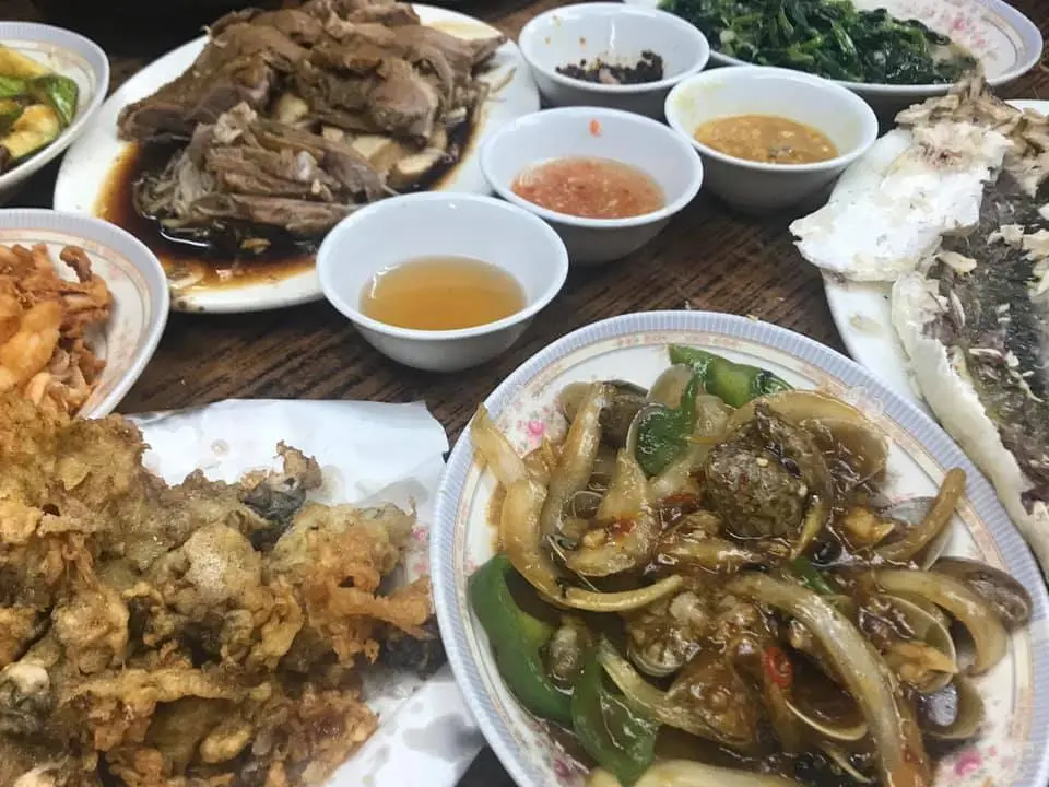 鹽焗烏頭、青芥末牛柳粒、潮州蠔餅、滷水鵝半隻、豉椒炒蜆、沙嗲韮菜粉絲肥牛煲、滷水雜拼、蒜蓉炒豆苗、韮菜豬紅、椒鹽鮮魷