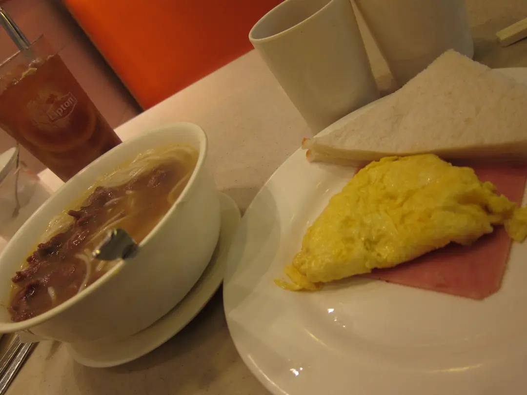 炒蛋火腿麵包+沙嗲牛肉米線