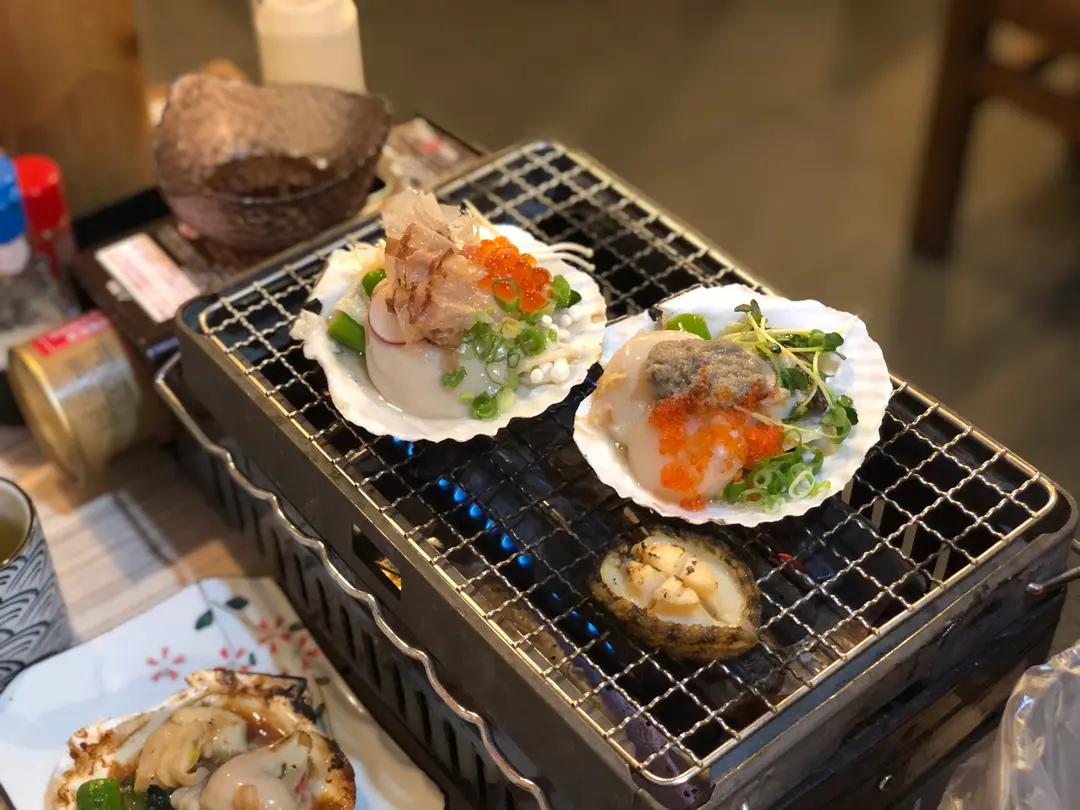 三文魚籽帆立殻燒、 蟹膏帆立殻燒