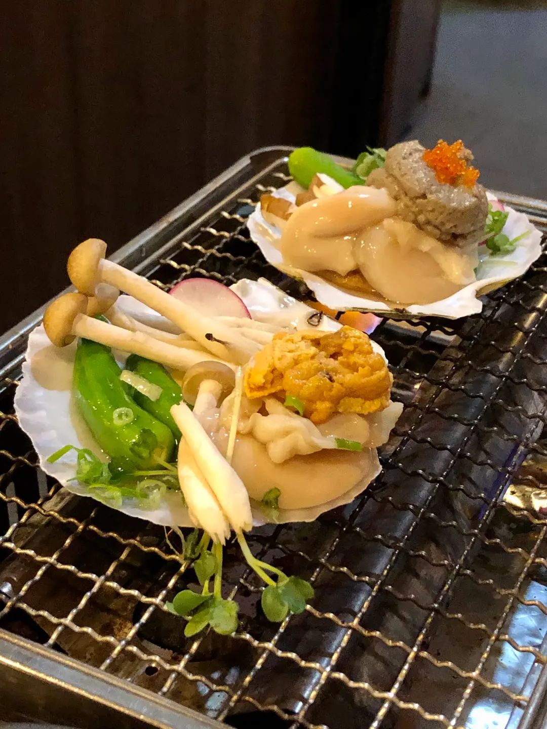 松葉蟹膏帆立殼燒和海膽帆立殼燒