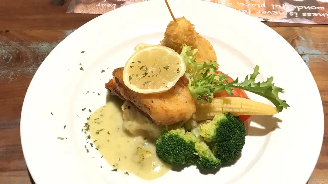 燒半烤煎扁雪魚香脆啤梨薯蓉配香草忌廉汁