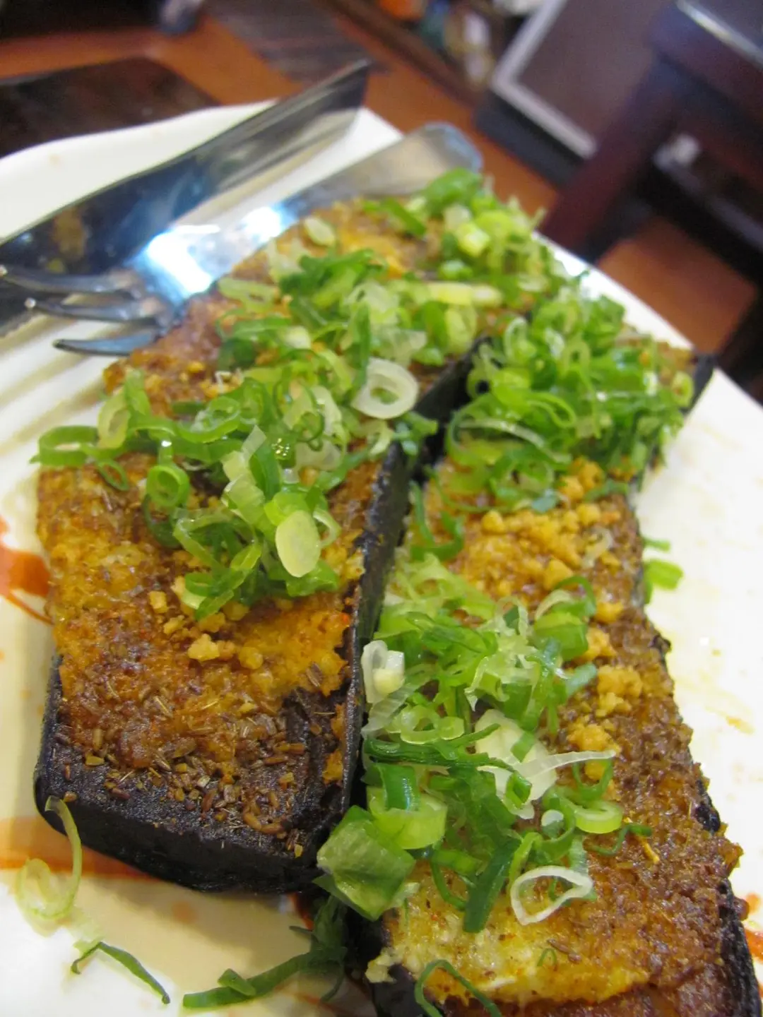 燒原條茄子面層滿是炸過的蒜泥、孜然、花生碎及蔥花等