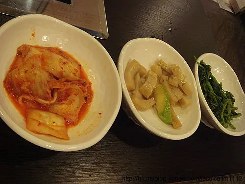 燒烤晚餐,有前菜三款,泡菜,魚片,莧菜