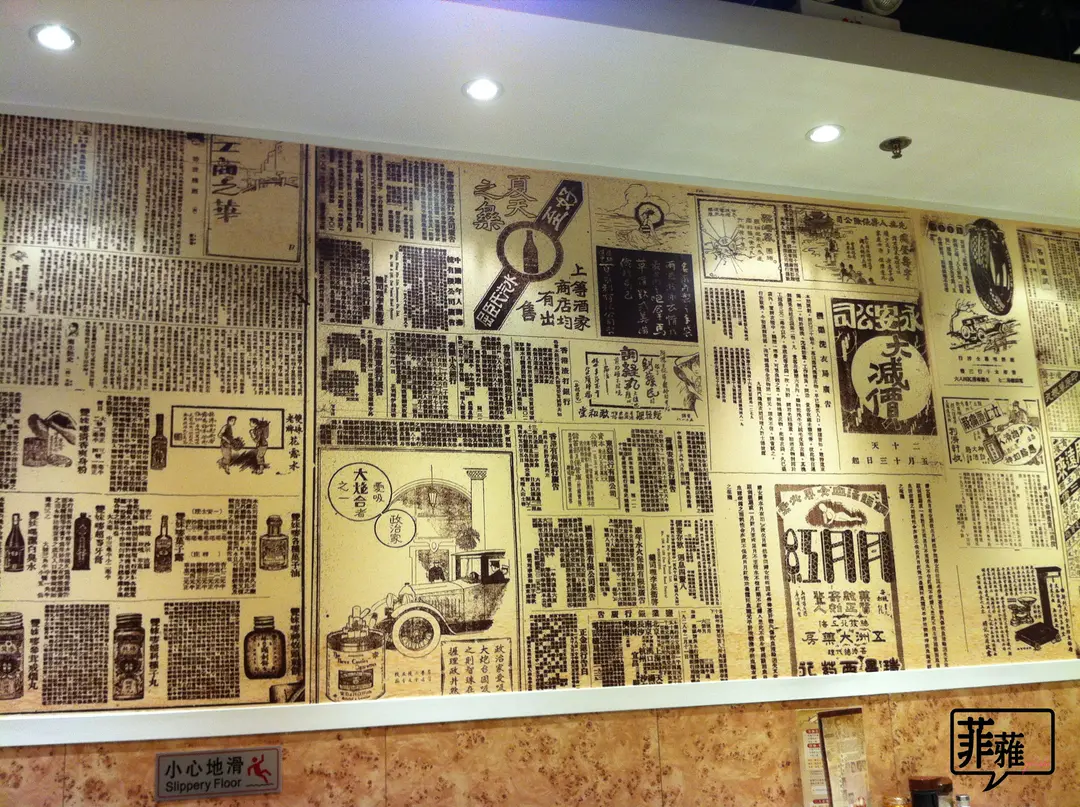 牆上貼上舊報紙作佈置。