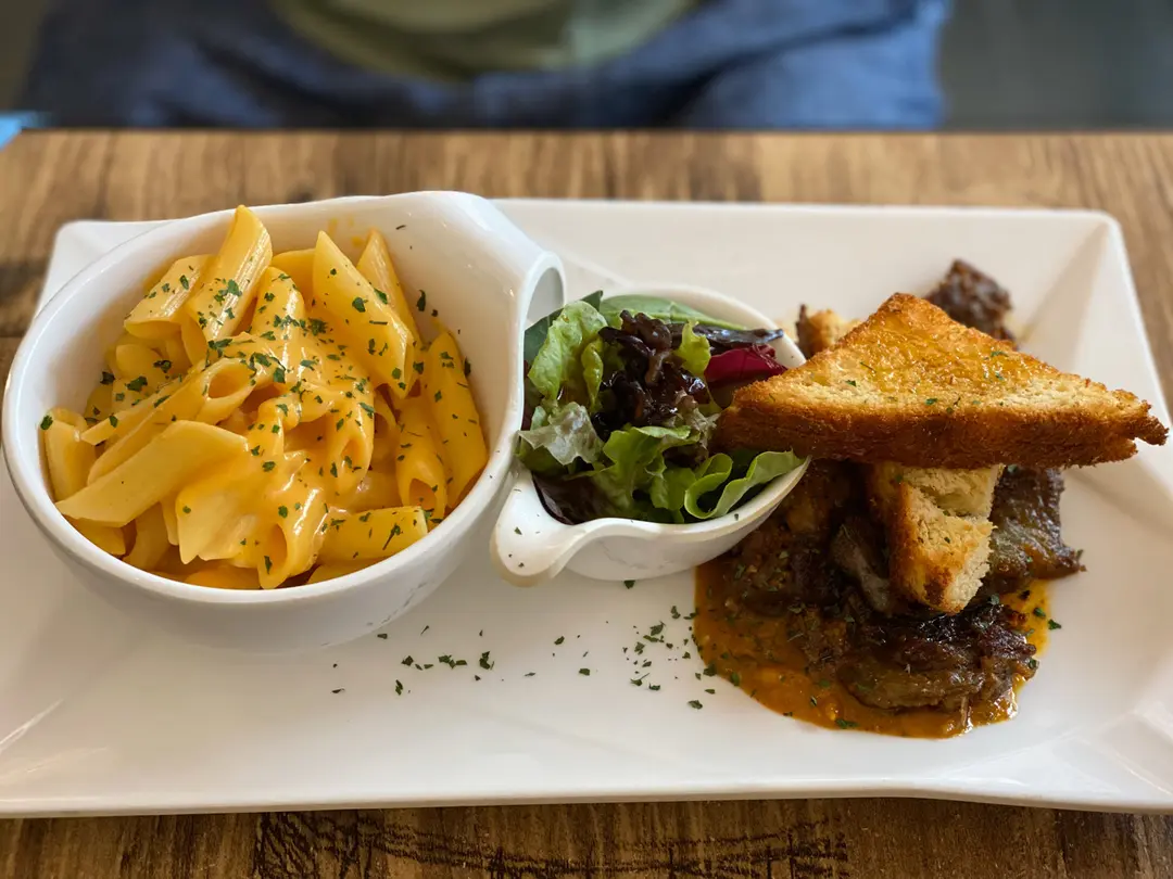 甘筍茸忌廉汁長通粉。檸檬醬法包。墨西哥莎莎醬鹽燒牛臉肉