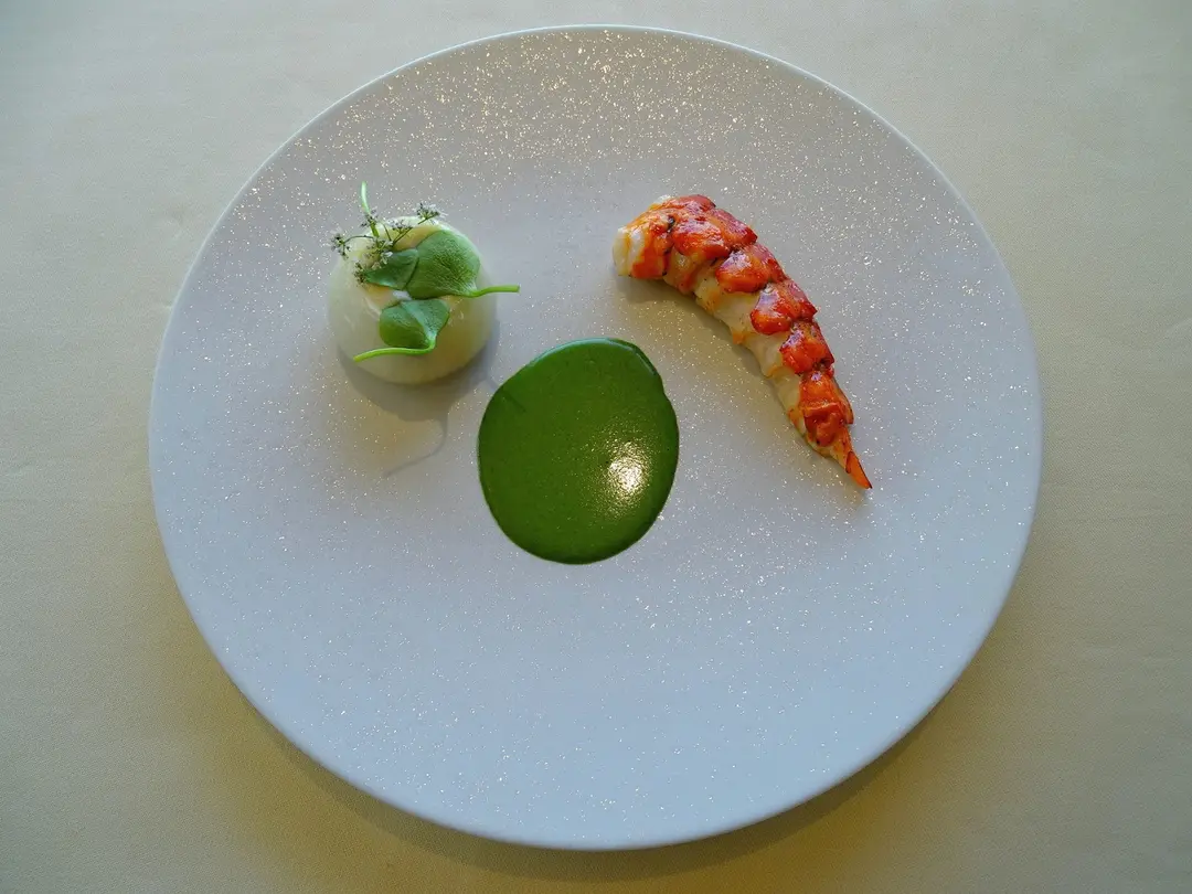 Poached lobster tail with spicy green sauce and Cevennes onion