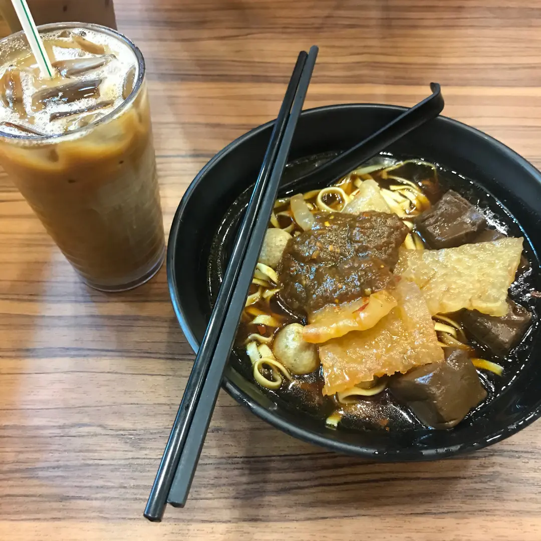 三餸粗麵配凍咖啡