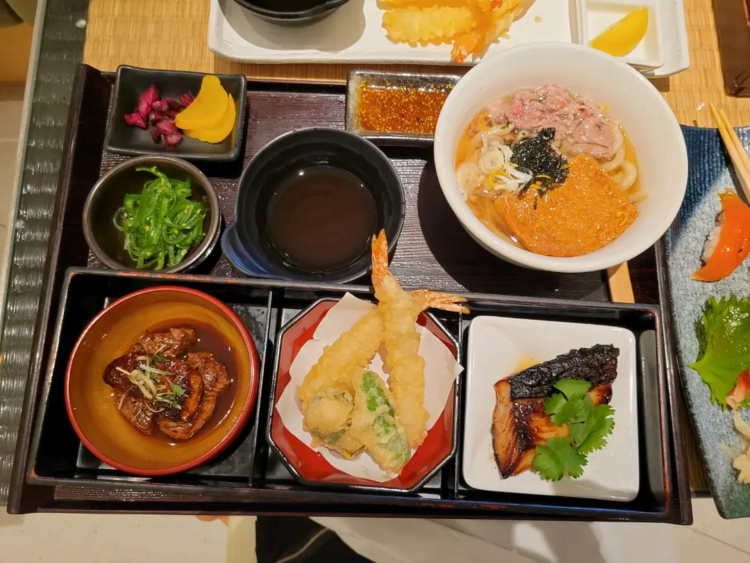特上便當定食的銀鱈魚西京燒、鵝肝牛柳、天婦羅及和牛烏冬