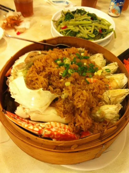 籠仔荷葉糯米蒸深海大花蟹,蟹生鮮及肉汁鮮甜,蟹汁和蟹羔融入糯米之中。