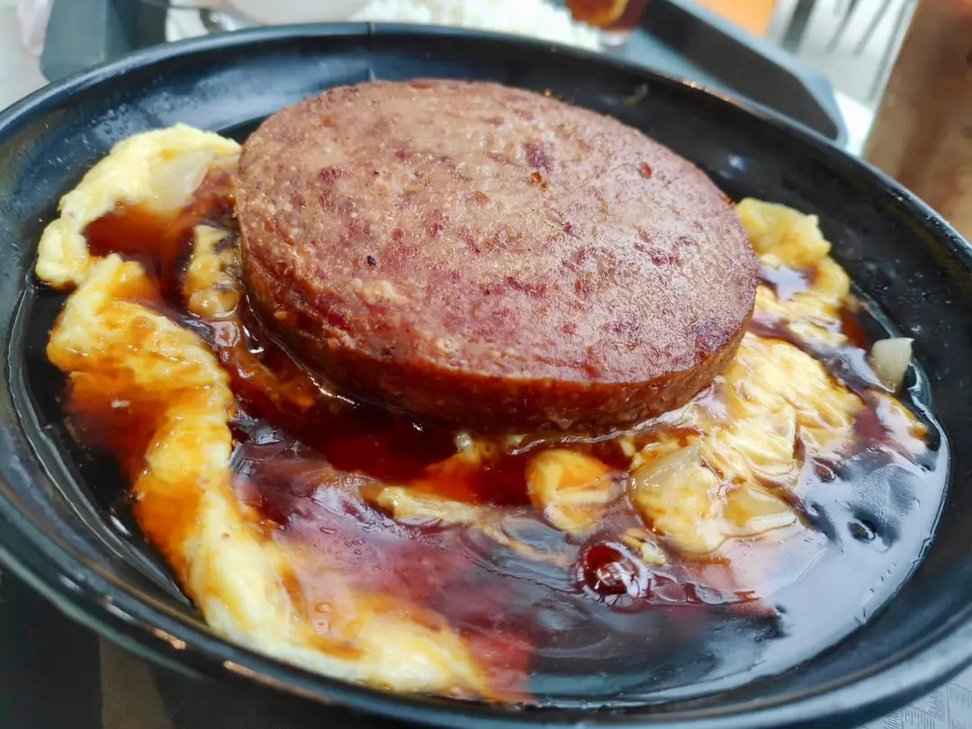 斬大嚿叉燒炸餐肉洋蔥滑蛋飯
