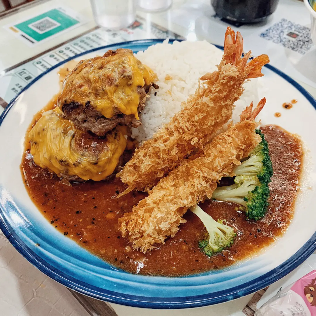 自家製雙層芝士漢堡牛肉飯配炸蝦飯