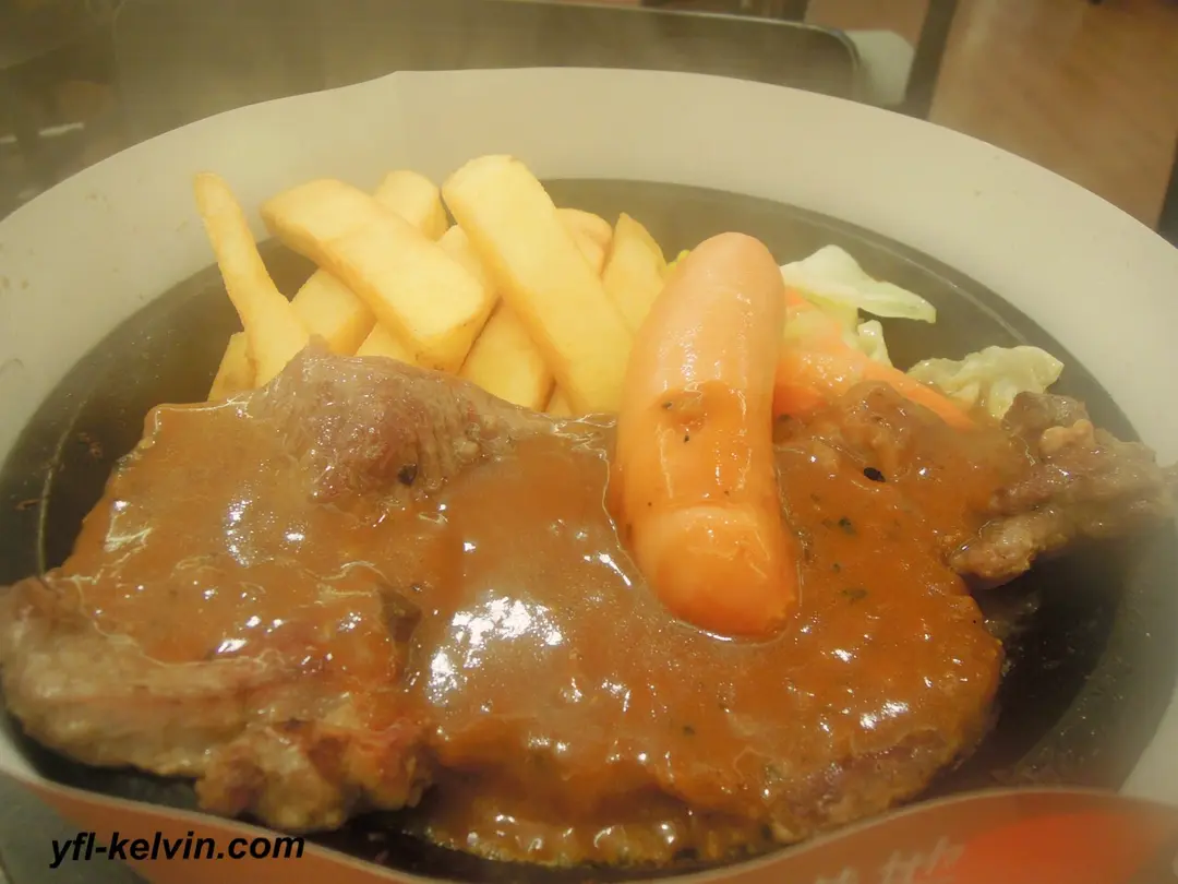 黑椒汁肉眼扒及司華力腸配薯條