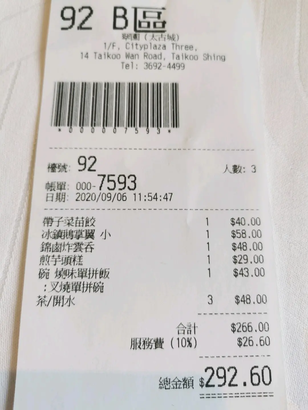 | 餐厅: | 翠園 (太古城中心) |