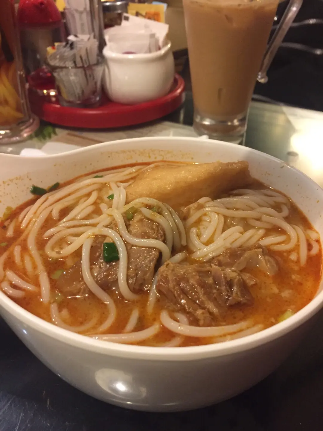 Tom-yum, pork, and fish cake noodles