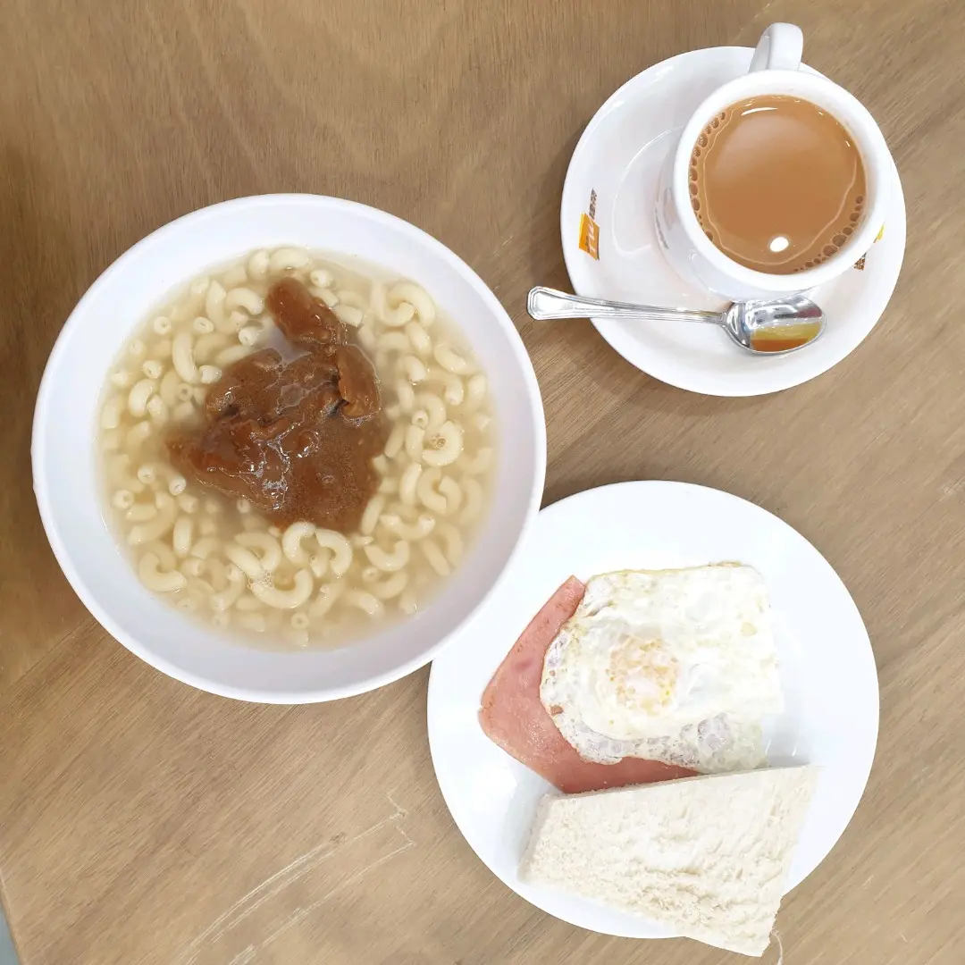 沙爹牛肉通粉 + 火腿煎蛋 + 奶茶小奶 (早餐)