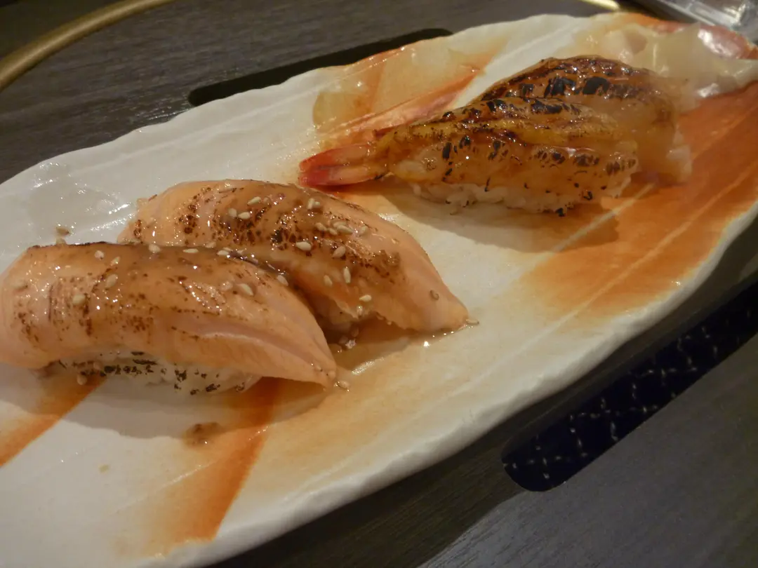 胡麻三文魚壽司(左)、咖哩蝦壽司(右)