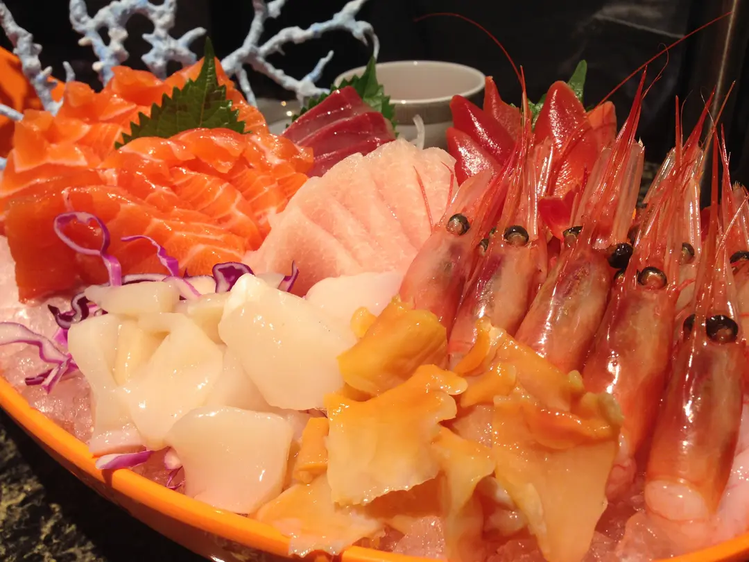 三文魚刺身、油甘魚刺身、劍魚腩刺身、北寄貝刺身、甜蝦刺身、赤貝刺身,鮮帶子刺身