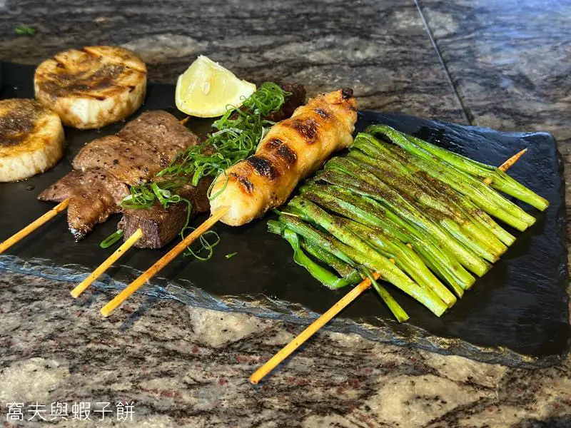 鹽燒牛舌心、汁煮牛舌、韭菜燒和招牌雞皮墨魚滑