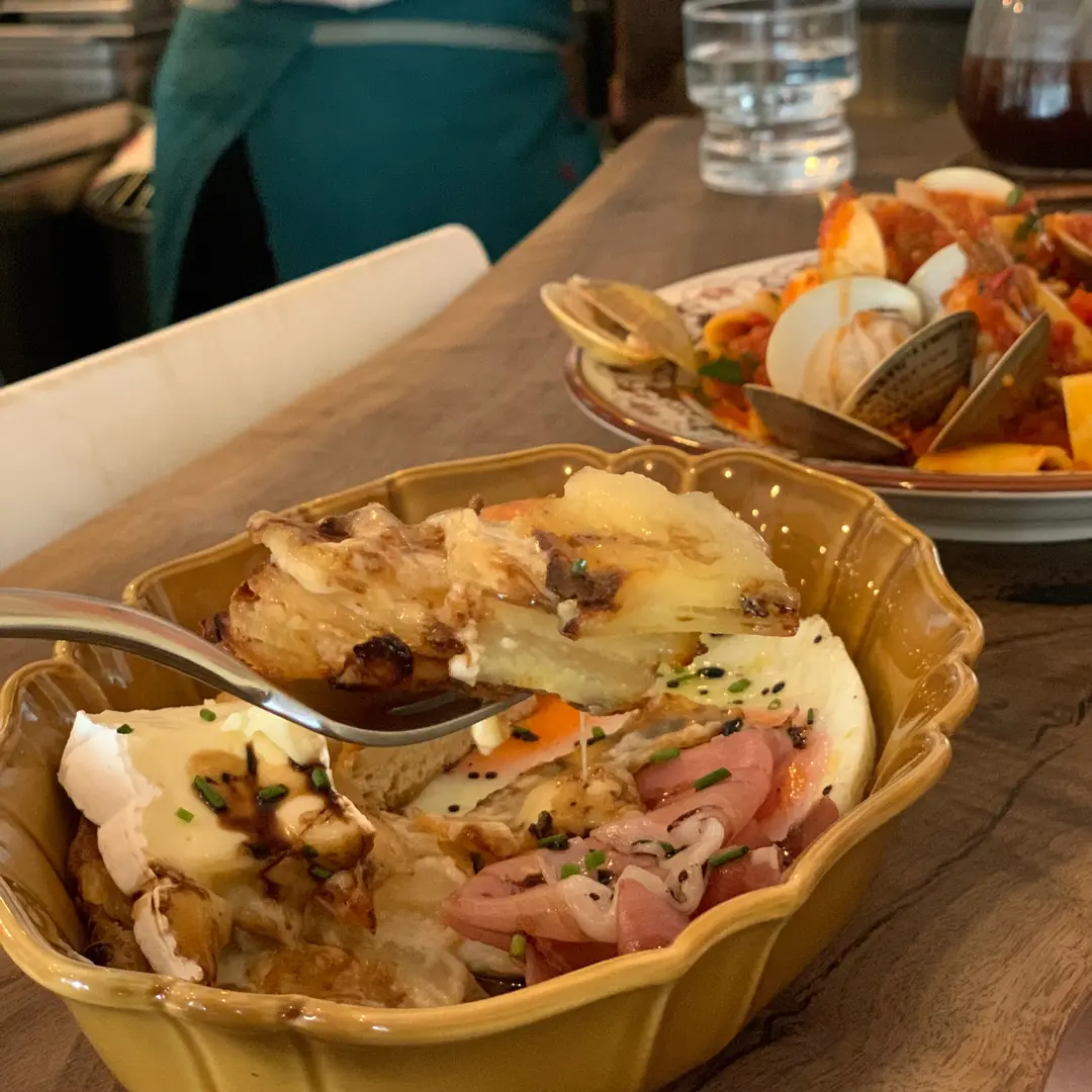 法式千層馬鈴薯批 。巴馬火腿。太陽蛋。自家麵包