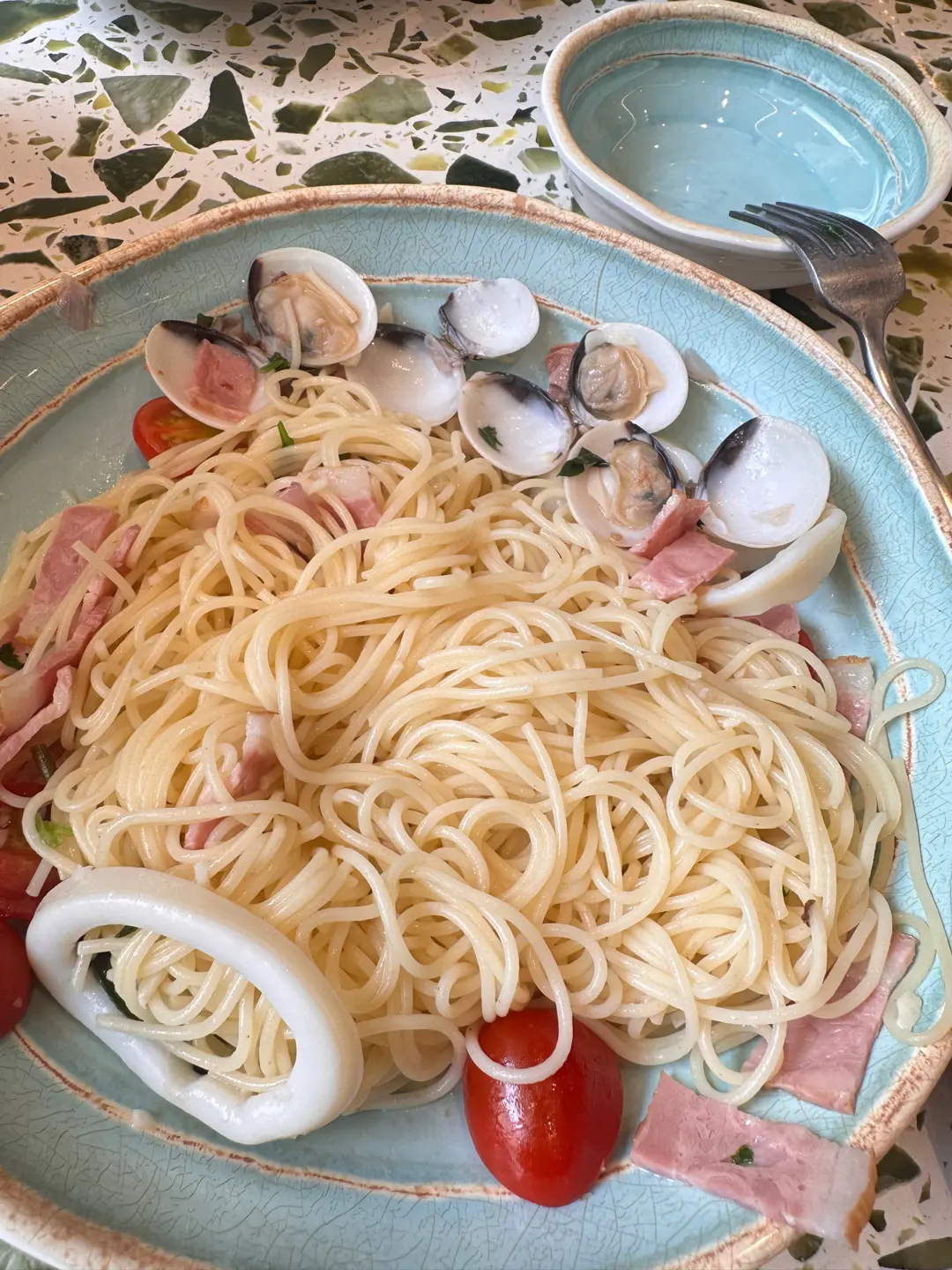 鮮蜆白酒煙肉蒜香天使麵
