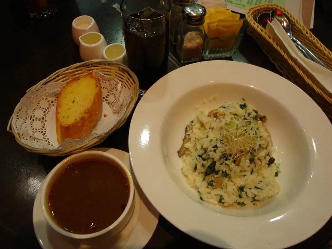 蒜蓉餐包,羅宋餐湯,莧菜蘑菇忌廉意大利飯