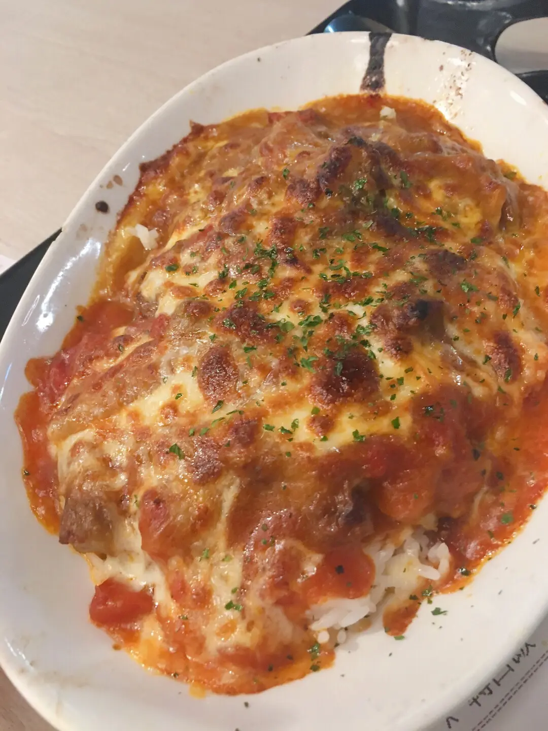 Baked beef/pork with rice and curry/tomato source