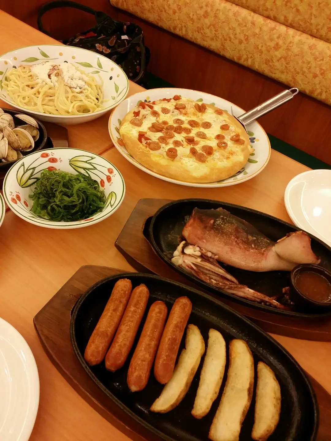 卡邦尼意粉,辣肉腸pizza,燒魷魚,香辣腸