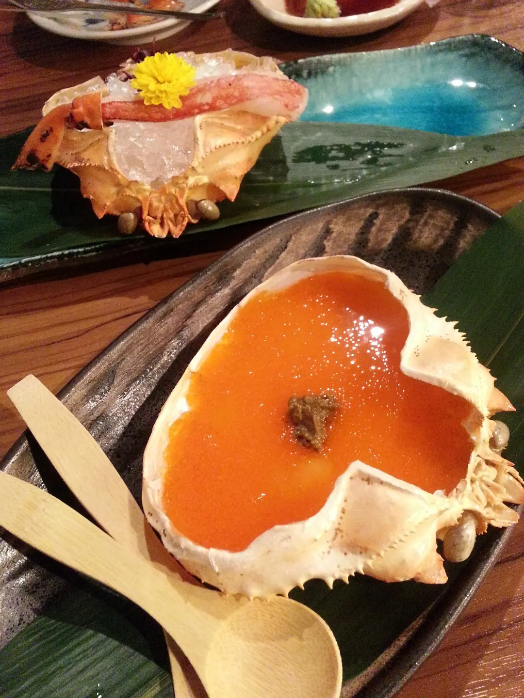 (上) 松葉蟹腳刺身; (下) 蟹蓋蒸蛋
