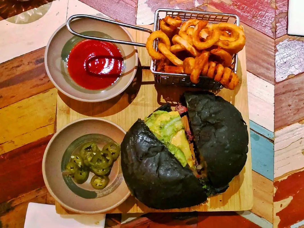 Cheese burger with guacamole and fries