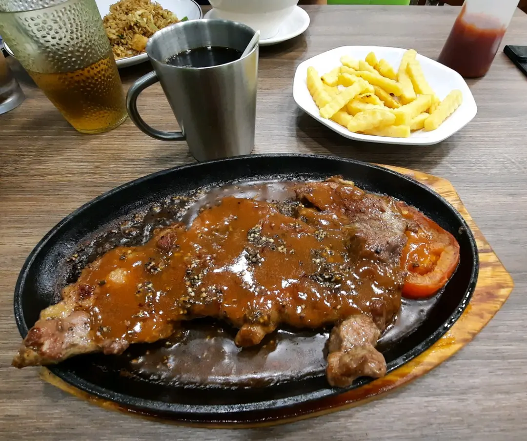 黑椒汁牛扒配薯菜鐵板餐,熱齋啡